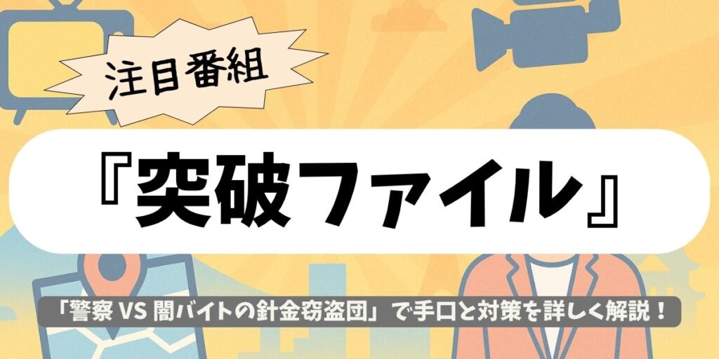 2025年10月2日(木)夜7時から放送されるTHE 突破ファイル 2時間スペシャルでは、「突破交番 VS 魔の針金窃盗団」という強烈なテーマが掲げられ、注目が集まっています。 番組公式 X(旧Twitter)では「警察 VS 闇バイトの針金窃盗団! 人質とるナイフ男を... -