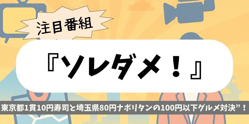 驚きと期待を胸に検索されたあなたへ── 2025年10月1日放送の「ソレダメ!」(テレビ東京)では、760円以下グルメ対決の中で、なんと東京都の1貫10円寿司と埼玉県の80円ナポリタンが“奇跡の100円以下グルメ対決”として紹介されました。 この対決は、ただ“安... -