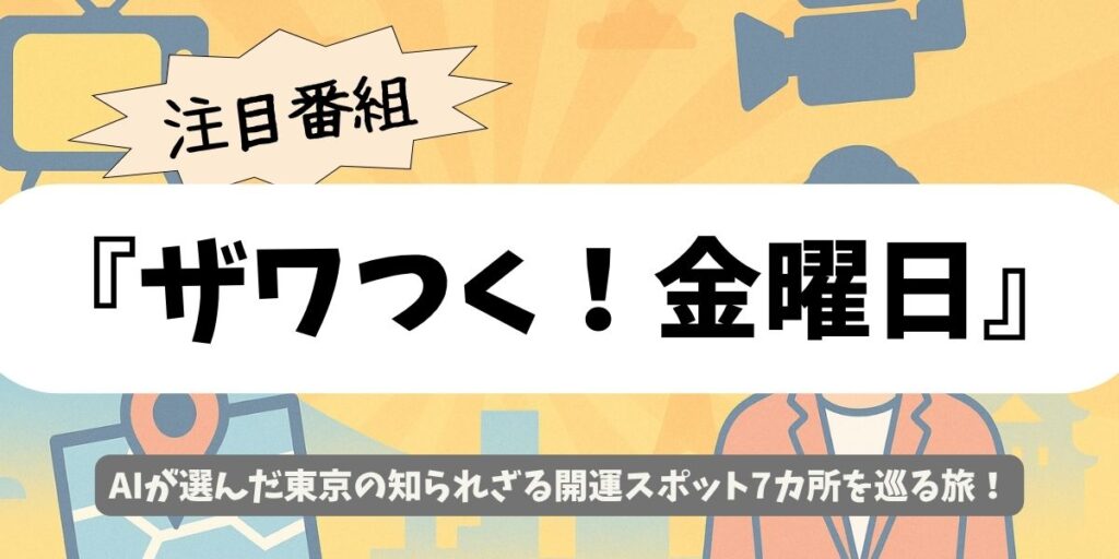 東京で「運を開きたい」「金運・厄除け・芸事上達を願いたい」—そんな思いを抱えるあなたに朗報です。 2025年10月3日(金)18:50から、テレビ朝日系で放送される『ザワつく!金曜日&ザワつく!開運ツアー 合体3時間SP』では、スタジオ企画と同時に「AIが... -