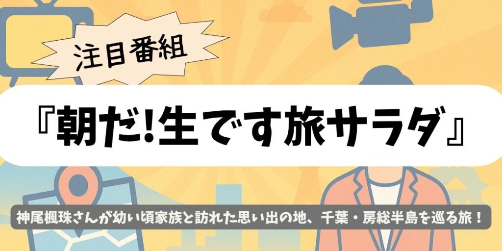 2025年10月4日(土)朝8時から放送される『朝だ!生です旅サラダ』。 この回の“ゲストの旅”には俳優の神尾楓珠さんが登場し、幼い頃家族と訪れた思い出の地でもある千葉・房総半島を巡る旅が展開されます。 番組の公式情報によれば、旅の行程は港町・富津... -