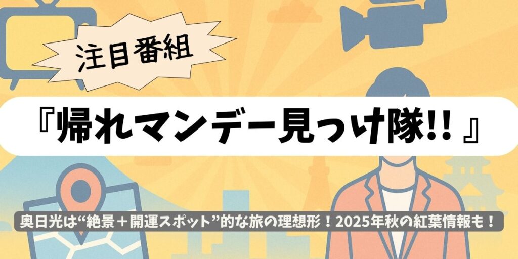 奥日光の紅葉に心を奪われたことがありますか? テレビ番組『帰れマンデー見っけ隊!!』の最新スペシャルで、タカアンドトシ&土屋アンナ&Matt&ずん・飯尾和樹が訪れた奥日光は、まさに“絶景+開運スポット”的な旅の理想形が詰まっています。 番組では、... -