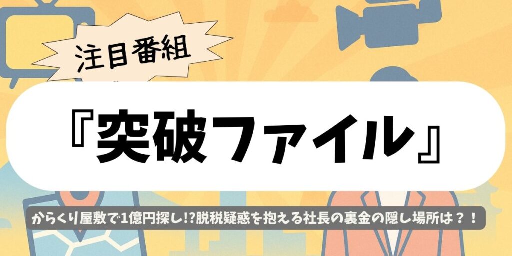 「突破ファイル」のからくり屋敷について検索されるあなたは、おそらく次のようなことを知りたくてこのキーワードを入力したのではないでしょうか。 “今回のからくり屋敷ってどういう構造?どこに1億円が隠されているの?出演者や見どころは?見逃したらど... -