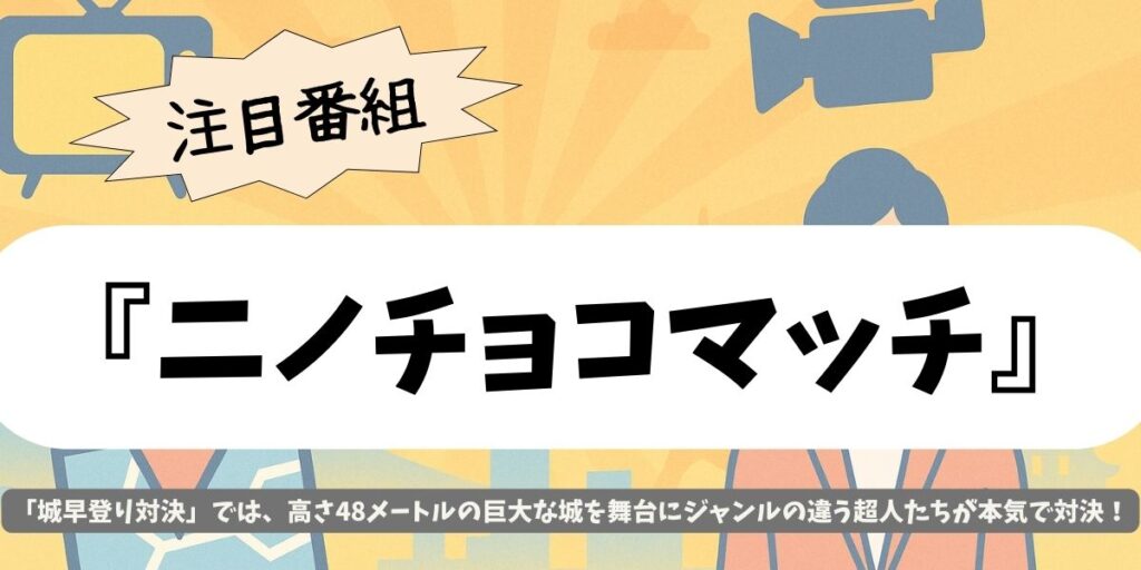 2025年9月3日(水)よる8時30分より、TBSにて注目の特番『ニノチョコマッチ』が放送されます。 本番組の最大の見どころとなる「城早登り対決」は、高さ48メートルの巨大な城を舞台に、クライミング金メダリスト・楢﨑智亜選手と、世界陸上銅メダリスト・藤... -
