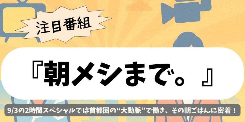 テレビ朝日が2025年9月3日(水)よる7時から放送する2時間スペシャル『朝メシまで。』は、「首都圏の“大動脈”で働き、その朝ごはんに密着する」というユニークな視点で構成された注目のドキュメンタリー企画です。 公式番組案内によると、密着対象は「24時...