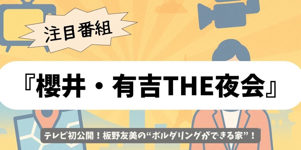「櫻井・有吉THE夜会 芸能人新居初公開SP」では、板野友美さんの“ボルダリングができる家”という、従来の“芸能人の自宅公開”番組にはなかった斬新な切り口が注目を集めています。 2025年9月4日(木)よる9時40分からTBS系列(MBSでも同時放送)にて放送さ... -